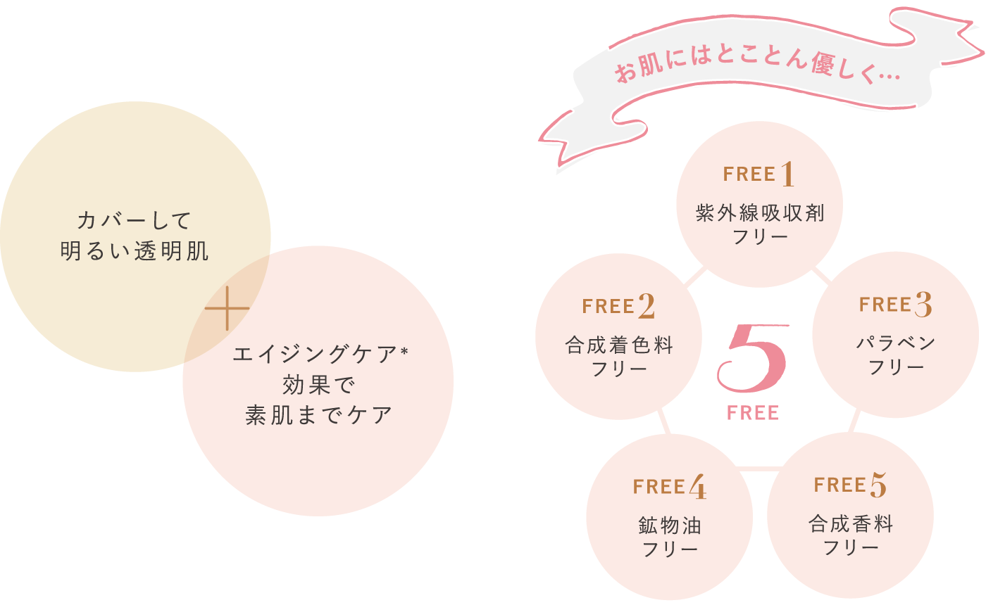 お肌へのやさしさにこだわりながら、メイク機能とエイジングケア*機能を実現します。