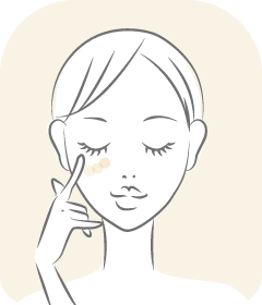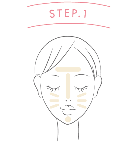 中3本の指を使って顔の中心から外側へ手早く、伸ばします。目の周り・小鼻・口もとはできるだけ薄く伸ばしてください。